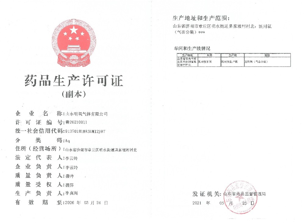 ??? 山東明氧氣體有限公司的前身為始建于1993年的章丘市明水氧氣廠,2020年12月企業由民營獨資轉型升級為山東明氧氣體有限公司,企業進入新的發展階段。公司位于山東省濟南市章丘區明水街道杲家坡村村北,占地面積4000平方米,注冊資金500萬元,固定資產投資3000萬元,主要經營項目為醫用氧氣、工業氧氣、氮氣、高純氮氣、氬氣、高純氬氣、高純氦氣、二氧化碳、混合氣體等各種工業氣體、高純氣體、混合氣體的充裝銷售、各類氣瓶的銷售、安全閥校驗、鋼質無縫氣瓶的檢驗等。